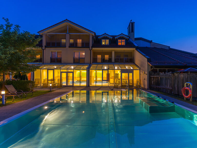 Unser beheizter Außenpool bietet Ihnen das ganze Jahr über wohlige Wärme und in unserem großzügigen Wellnessbereich erwartet Sie eine Oase der Entspannung: