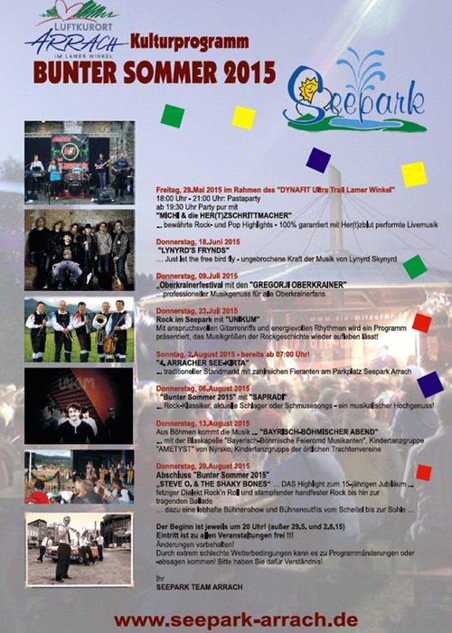 Im Jahr 2015 geht das Kult(ur)programm im Arracher Seepark bereits in die "15. Runde"! Der "Bunte Sommer 2015" präsentiert sich mit musikalischen Leckerbissen und einem ausgewählten Mix verschiedener Musikstilrichtungen. Wir wünschen all unseren Gästen viel Spaß!