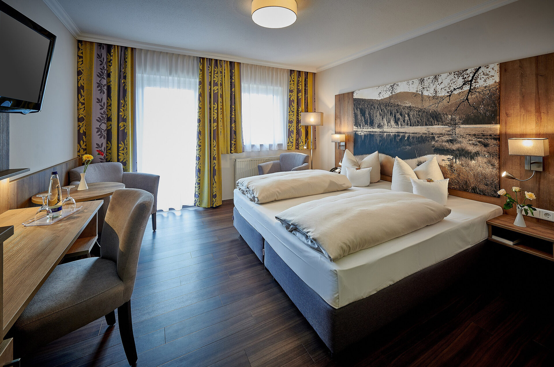 Schreibtisch mit Leuchte, Verdunklungsgardinen, Boxspringbetten (1,80m x 2m) mit Leseleuchte & ausziehbare Schlafcouch (für 1 Kind), großer HD-Flat-TV, Minibar, Laptop-Safe, Wolldecken.