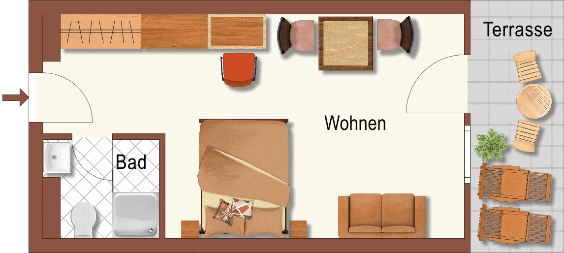 Komfortable Studios (zur neu angelegten Gartenseite) mit Terrasse, entweder Badewanne oder Dusche